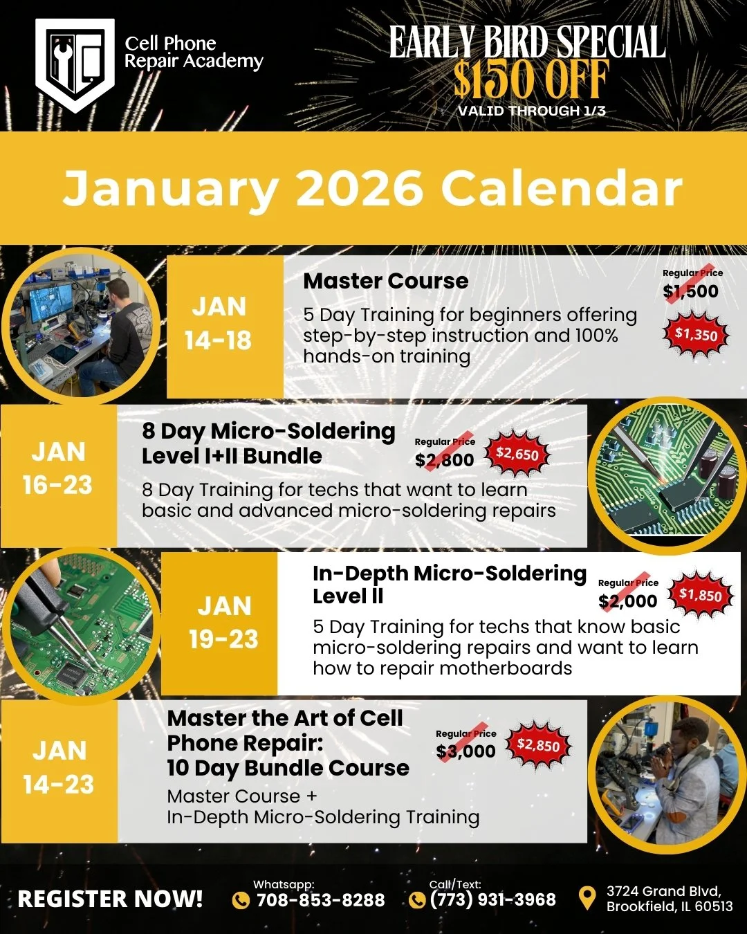Register for any of our courses below or click here to learn more about our private training options. We look forward to helping you expand your knowledge and skills in cell phone and tablet repairs!
