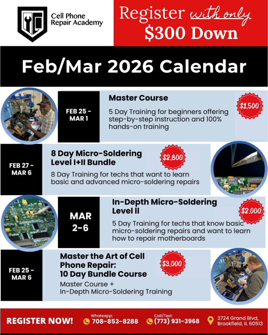 Our team is available to answer any questions you may have regarding our courses and services. Please feel free to reach out to us via call, text, or email at your convenience. We are committed to providing you with the support and guidance necessary to help you achieve your goals in mobile electronic repairs.